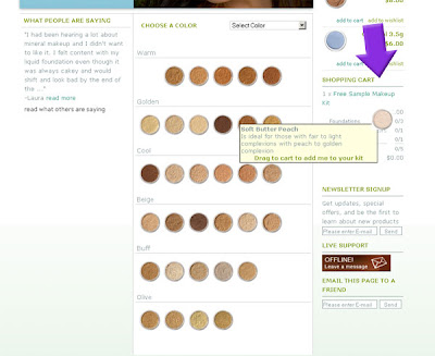 Você agora deverá ir selecionando, dentro de cada categoria disponível no seu kit (foundations, concealers…) as cores que quer receber. Para selecionar uma cor, basta clicar e arrastar até o seu shopping cart, na barra lateral.