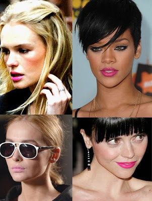Por ser uma pessoa muuuito pálida, sempre acho que preciso de um toque de cor para não fica parecendo um fantasminha. A minha atual favorita é o rosa! Até bem pouco tempo achava o rosa uma cor muito infantil, não usava muita maquiagem nessa cor. Acho que é porque tooodos os kits de criança têm batom rosa e sombra azul né? Hahaha… Enfim, agora eu só quero usar cor de rosa na boca, e por isso adoro pesquisar fotos para ver como posso usar a cor de modo mais elegante e menos criança-feliz-dos-anos-80. O que eu ainda preciso aprender é como comer usando um batom de cor forte, porque quando tento, fico exatamente igual uma palhaça!!!