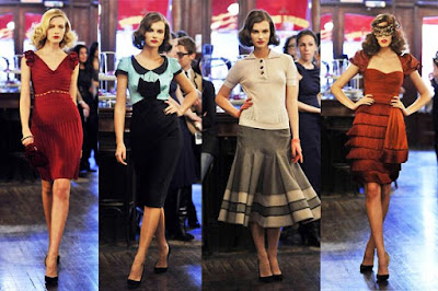O clima anos 40 da coleção combinou demais com a locação escolhida, e como estou numa fase bem lady, adorei os vestidos em tons fortes e, principalmente, os conjuntos de saia e blusa, como os do meio da imagem aí de cima.