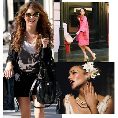 Nas fotos menores, um vintage mais elegante, com Camilla Belle de vestido + casaco em tons fortes + acessórios neutros (e aura 60`s) e Paula Patton, encarnando Billie Holliday no maior estilo diva, de tons neutros e batom marcado (mas as unhas são anos 2000!).