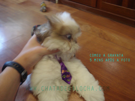No último fim de semana, marido levou o bichinho ao Pet Shop pra tomar banho. Ele voltou de gravatinha, e como marido sabia que ele não ia aguentar ficar com ela muito tempo, resolveu tirar uma foto para eu ver… Ele odeia fotos: